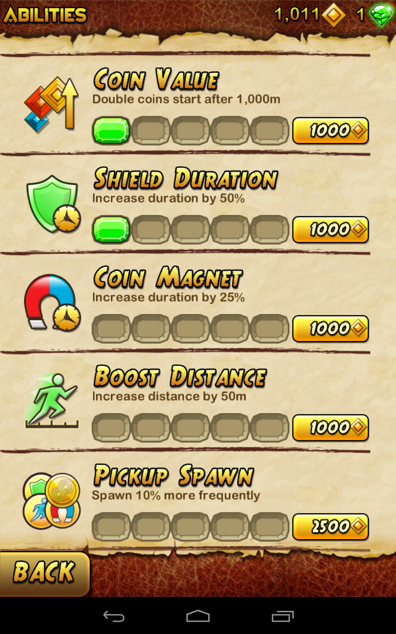 Durante nuestra carrera sin fin podremos coger monedas y power ups (mejoras). Las mejoras las podemos usar tocando sobre la pantalla dos veces o bien se activarán directamente (depende de la mejora).