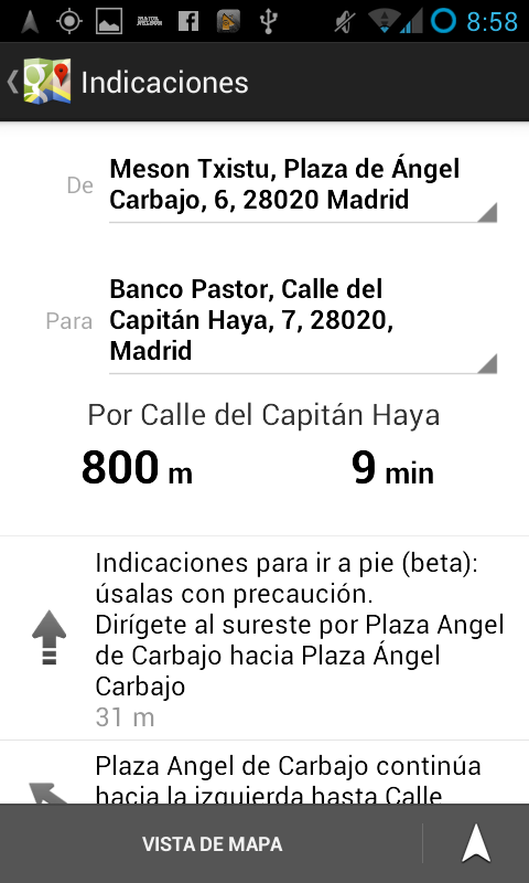 Indicaciones, nos abrirá una pantalla para realizar una búsqueda del destino, pudiendo elegir también el origen. Esta parte la explicaremos más a fondo en un ejemplo posterior.