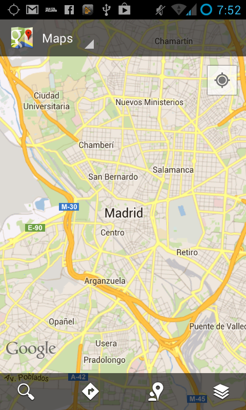 Capas, nos permite complementar la vista del mapa con información adicional, como estado del tráfico, vista por satélite relieve, lineas de transporte público… etc… La vista por satélite es espectacular, pero cuidado consume muchos datos (importante si tenemos una tarifa limitada de internet).