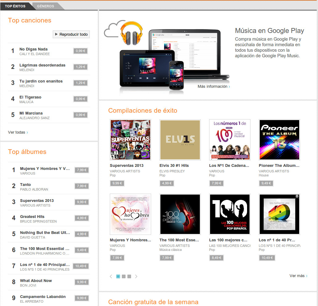 - Tienda de música a la que podemos acceder desde google play. La música que aquí compres la tendrás disponible para reproducir mediante web, en tus dispositivos Android o bien descargarla para utilizar en otros dispositivos. Los precios similares a las demás tiendas de música por internet, unos 0.99€/canción y un precio medio de 4.99 €/ disco. Aquí no vamos a profundizar mucho más. Podéis echarle un vistazo directamente desde Google Play en vuestro ordenador o dispositivo android y pulsando sobre música.