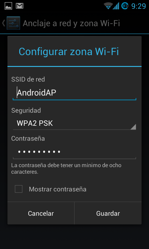 Conexión vía WiFi (zona wifi). Para mi es el mejor. Nuestro dispositivo con conexión a internet se convierte en un router WiFi, pudiendo dar servicio a varios dispositivos al mismo tiempo. No necesitaremos transportar cables, y cualquier dispositivo con WiFi podrá conectarse. Solamente tendremos que configurar la seguridad de nuestra conexión para que no se nos conecte cualquiera.